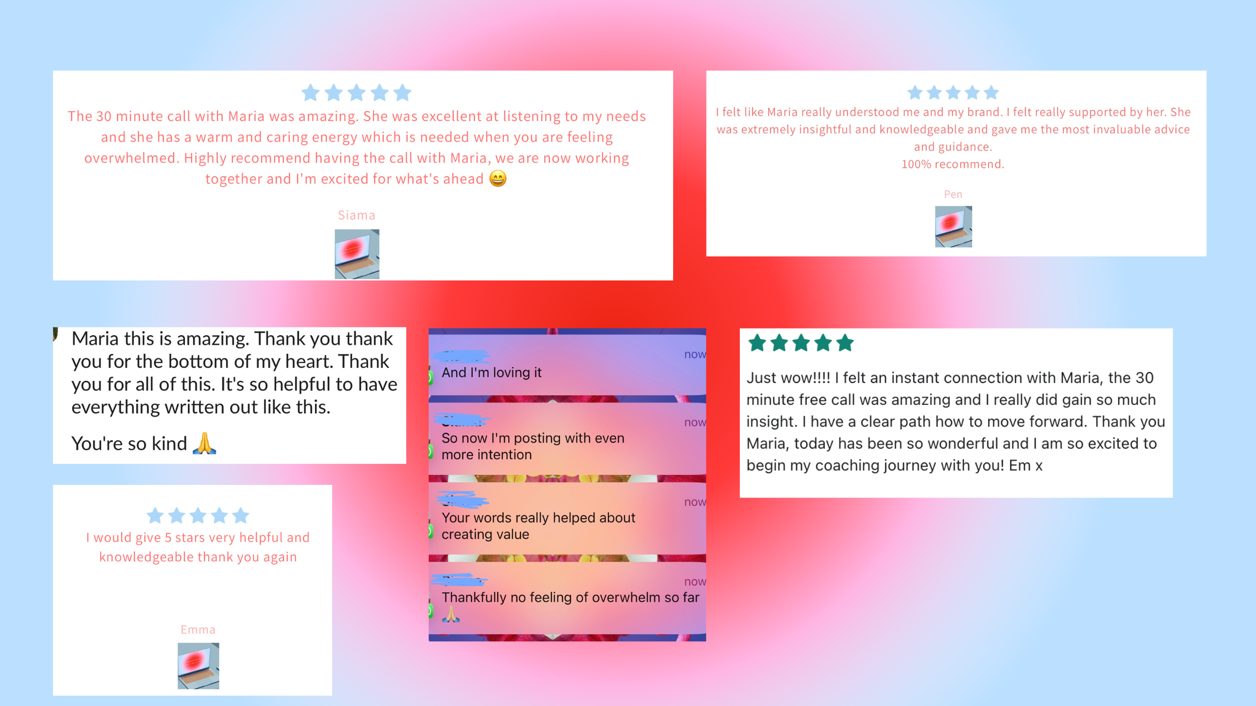 The 30 minute call with Maria was amazing. She was excellent at listening to my needs and she has a warm and caring energy which is needed when you are feeling overwhelmed. Highly recommend having the call with Maria, we are now working together and I'm excited for what's ahead 😄